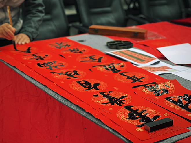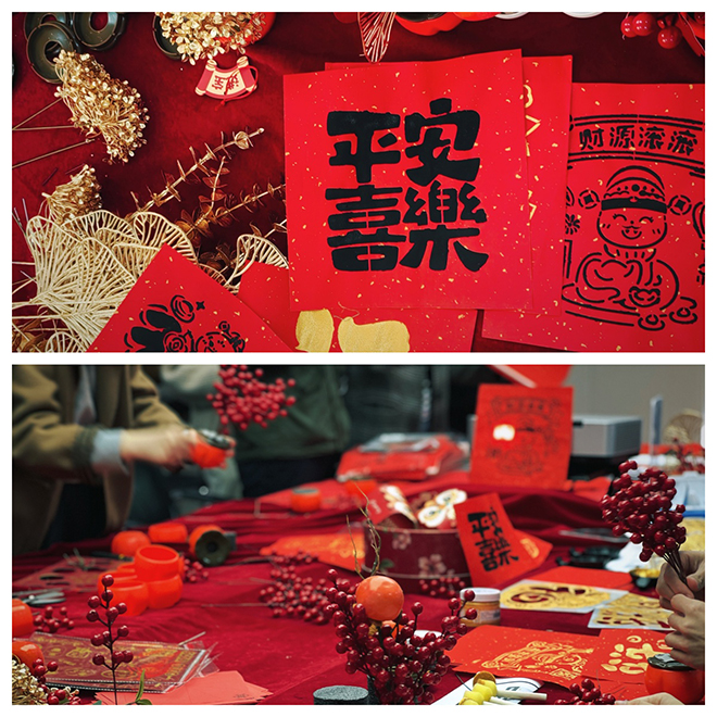 春聯(lián)區(qū),書(shū)法大師把祝福之情融入每一個(gè)筆畫之中,隨著一副副蒼勁有力的對(duì)聯(lián)和喜慶吉祥的‘福’字躍然紙上,前來(lái)領(lǐng)取的員工們絡(luò)繹不絕。